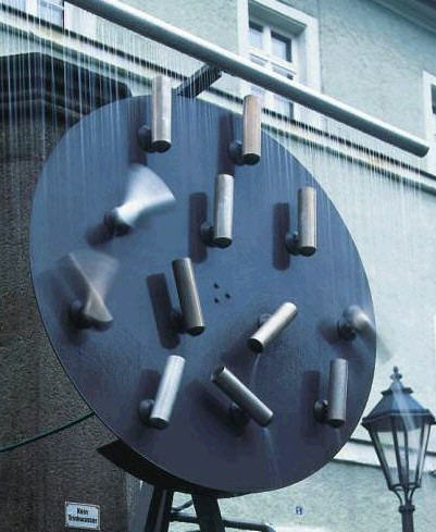 | Wasserchaosscheibe Auf einer Stahlscheibe sind zwölf Zylinder beweglich angebracht. Der Boden der Zylinder besteht aus Blei. Sie richten sich daher mit ihrer Öffnung nach oben aus. Sie werden mit Wasser berieselt und füllen sich dabei langsam. Irgendwann liegt ihr Schwerpunkt über ihrer Achse und sie kippen um, entleeren sich und richten sich wieder auf. Dadurch ändert sich ständig der Schwerpunk der drehbaren Scheibe, auf der die Zylinder befestigt sind. Sie dreht sich daher mal links, mal rechts herum, mal schnell mal langsam. Zusätzlich ist die Scheibe an einem Excenter mit Gegengewicht aufgehangen, dadurch verschiebt sich der Mittelpunkt der Scheibe auf einer Kreisbahn. Diese Skulptur ist ein gemeinsames Projekt mit Bernward Frank. |
